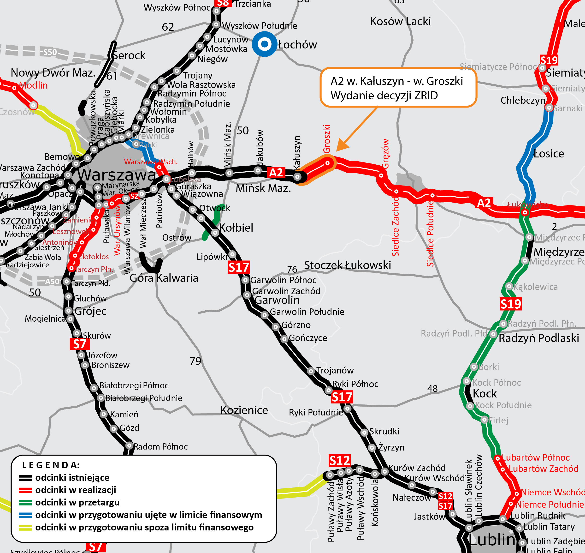 W poniedziałek, 13 grudnia 2021 r. mogą rozpocząć się prace budowlane odcinka autostrady A2 Kałuszyn–Groszki, pierwszego z trzech składających się na trasę między Mińskiem Mazowieckim a Siedlcami. Mazowiecki wojewoda wydał zgodą na realizację inwestycji drogowej (ZRID).